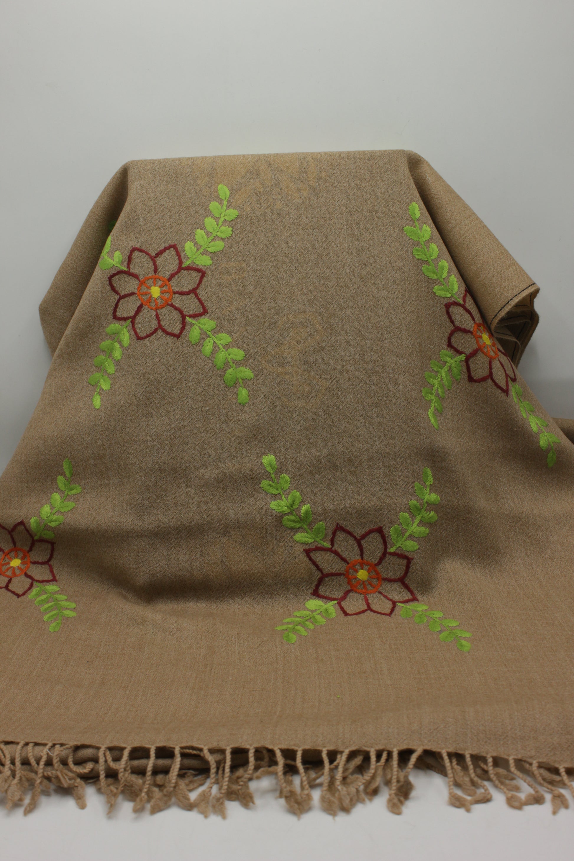 PREMIUM QUALITY LIGHT BROWN EMBROIDERED WOOLEN SHAWL FOR WOMEN